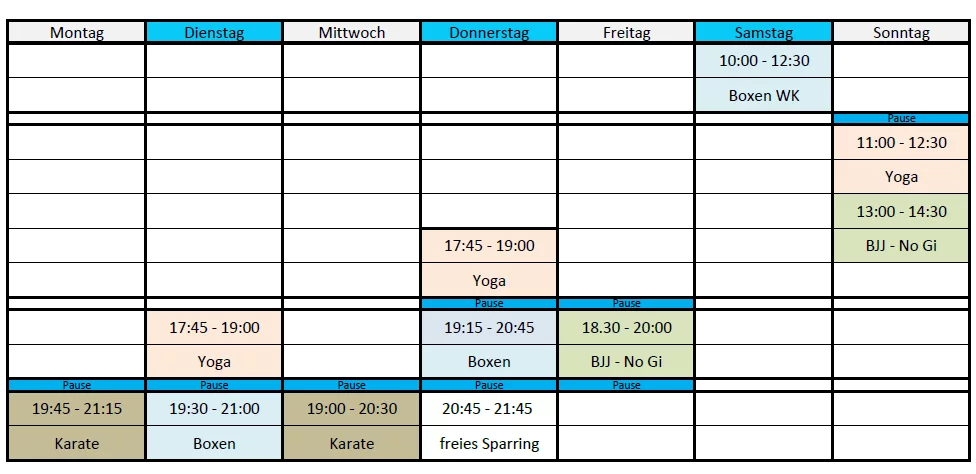 Die Kurse finden dreimal die Woche statt. Die Zeiten entnehmt ihr bitte dem Zeitplan oben.