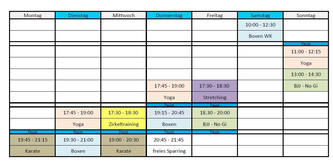 Die Kurse finden dreimal die Woche statt. Die Zeiten entnehmt ihr bitte dem Zeitplan oben.